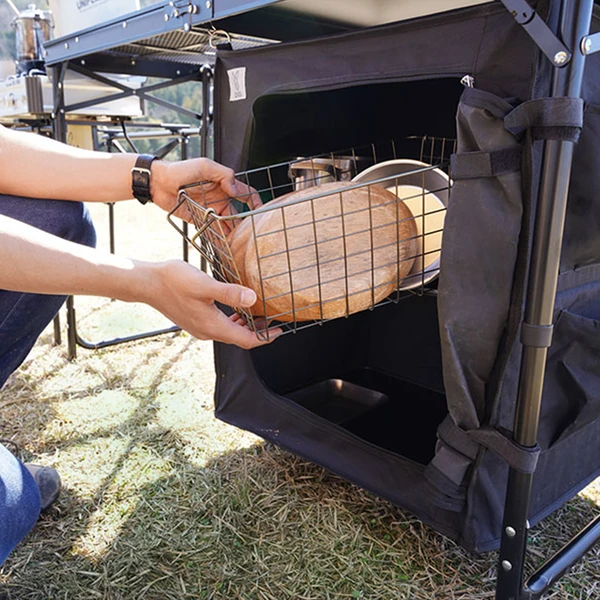 A kitchen table in a campsite that is different from the kitchen in my familiar home. The cooking utensils are scattered all over the place, and the camp food prepared with great effort cannot be left. You’ve never had that experience. Good news for you. With this Cooking King, you can solve such problems in no time. A neatly lined kitchen tool. Organized tableware. On the 120 cm spacious top plate, you can arrange as many cooking utensils and ingredients as you need, and your hands will grow naturally like in the usual kitchen. If you store things you don’t need or don’t want to see on the shelves, the area around the counter will be refreshing. With this cooking king, camping food is at your disposal.