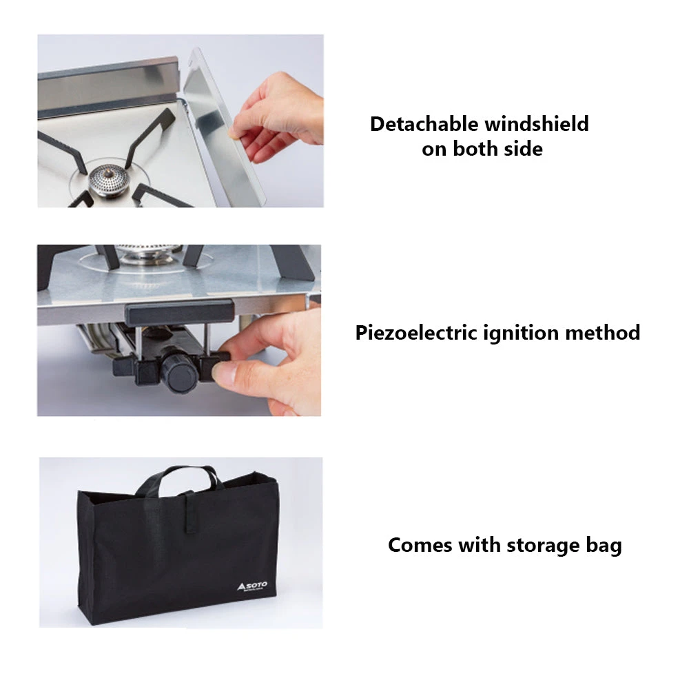 - Material: Main body: stainless steel | Trivet: iron | Stand/windshield (for back, both right and left): aluminum | Ignition switch/appliance plug knob: resin